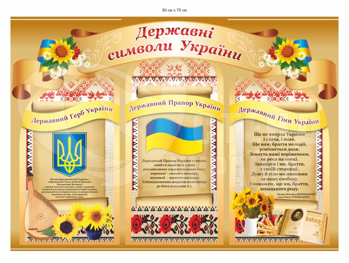 Куточок з державною символікою — інформаційний стенд для шкіл та інших навчальних закладів, присвячений державній символіці України. Містить інформацію про Державний Герб, Прапор та Гімн України, сприяє патріотичному вихованню учнів і формуванню поваги до національних символів. Підходить для оформлення класних кімнат, коридорів та патріотичних куточків у закладах освіти.